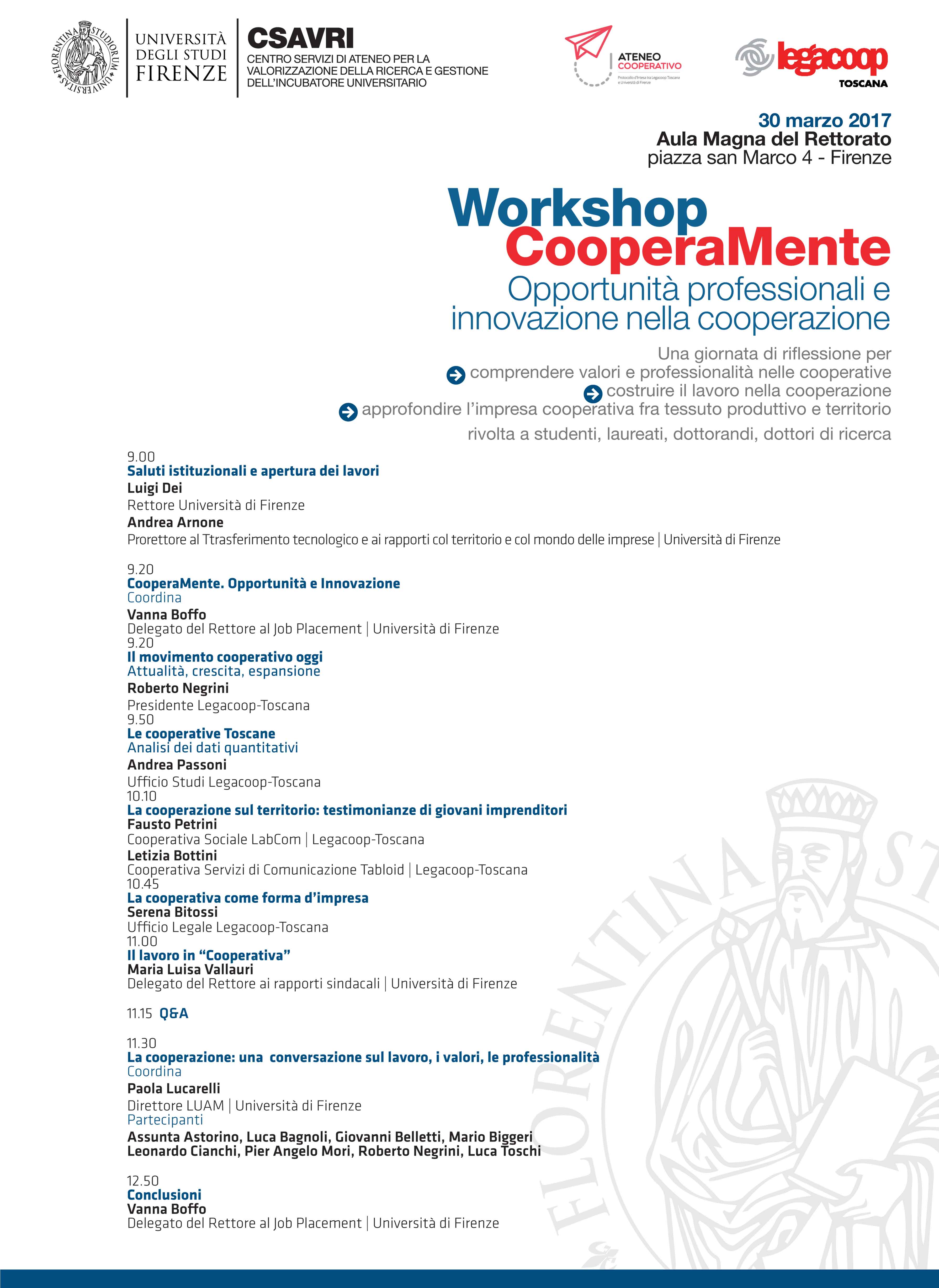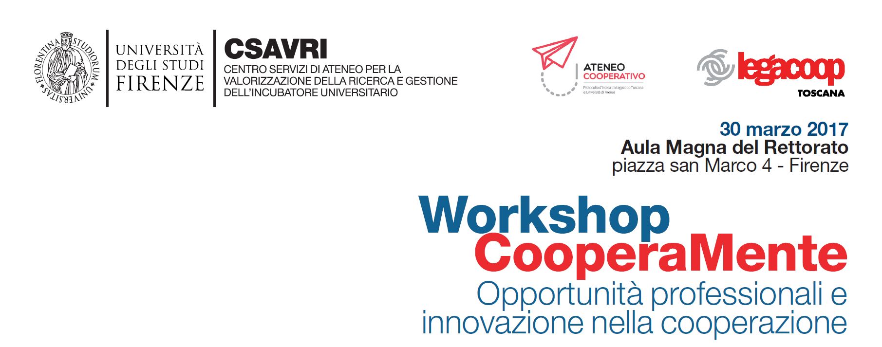 Legacoop Toscana in collaborazione con l’Università di Firenze organizza la prima iniziativa di CooperaMente, una serie di incontri  dal titolo “Opportunità professionali e innovazione nella Cooperazione”, che si terrà giovedì 30 marzo p.v. presso l’Aula Magna del Rettorato, piazza San Marco 4, Firenze.