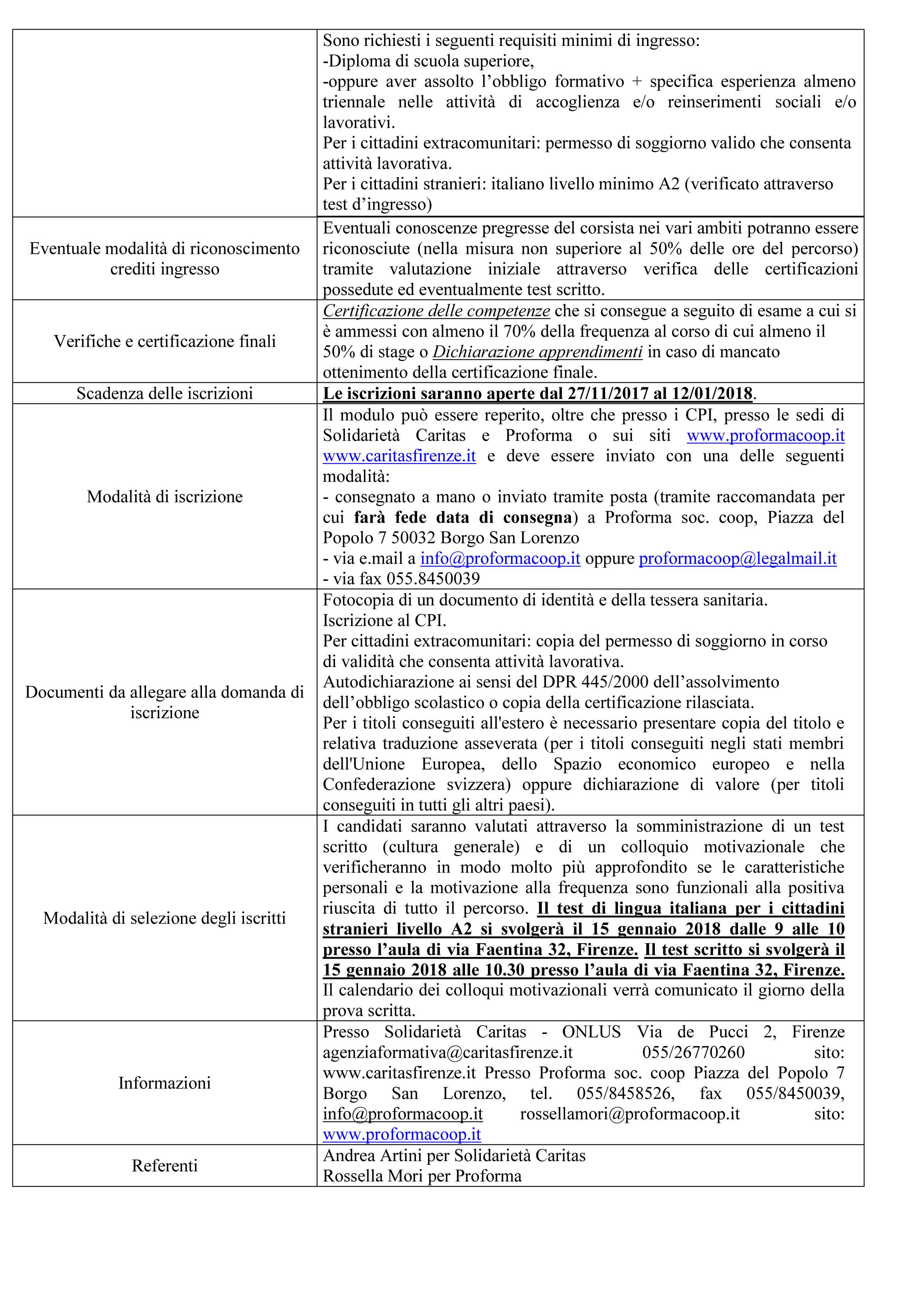 Modalità di selezione: i candidati saranno valutati attraverso la somministrazione di un test scritto (cultura generale) e di un colloquio motivazionale che verificheranno in modo molto più approfondito se le caratteristiche personali e la motivazione alla frequenza sono funzionali alla positiva riuscita di tutto il percorso. Il test di lingua italiana per i cittadini stranieri livello A2 si svolgerà il 15 gennaio 2018 dalle 9 alle 10 presso l’aula di via Faentina 32, Firenze. Il test scritto si svolgerà il 15 gennaio 2018 alle 10.30 presso l’aula di via Faentina 32, Firenze.